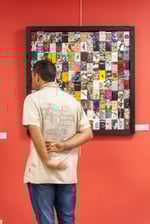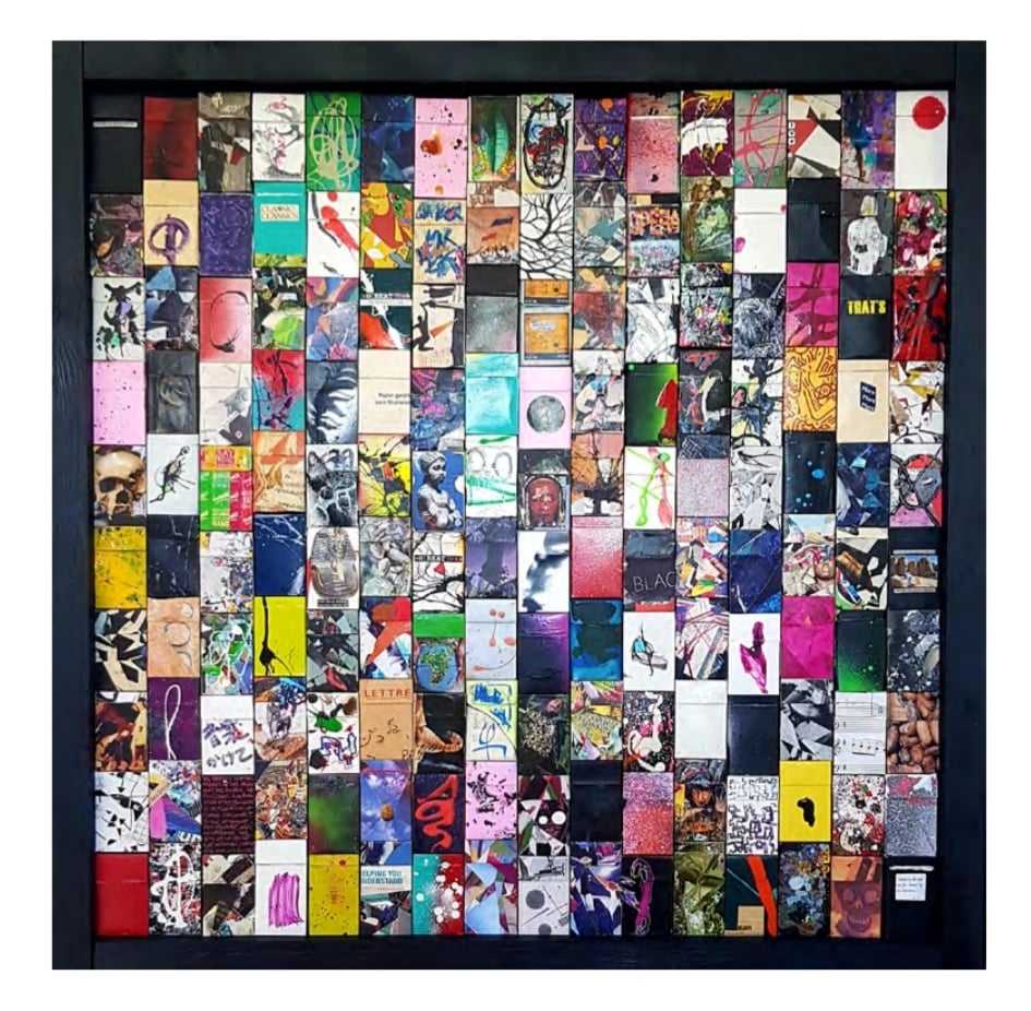 100 x 100 cm. Technique mixte sur boîtes de cigarettes upcyclée (musique originale interactive téléchargeable via qr code placé à l'intérieur)