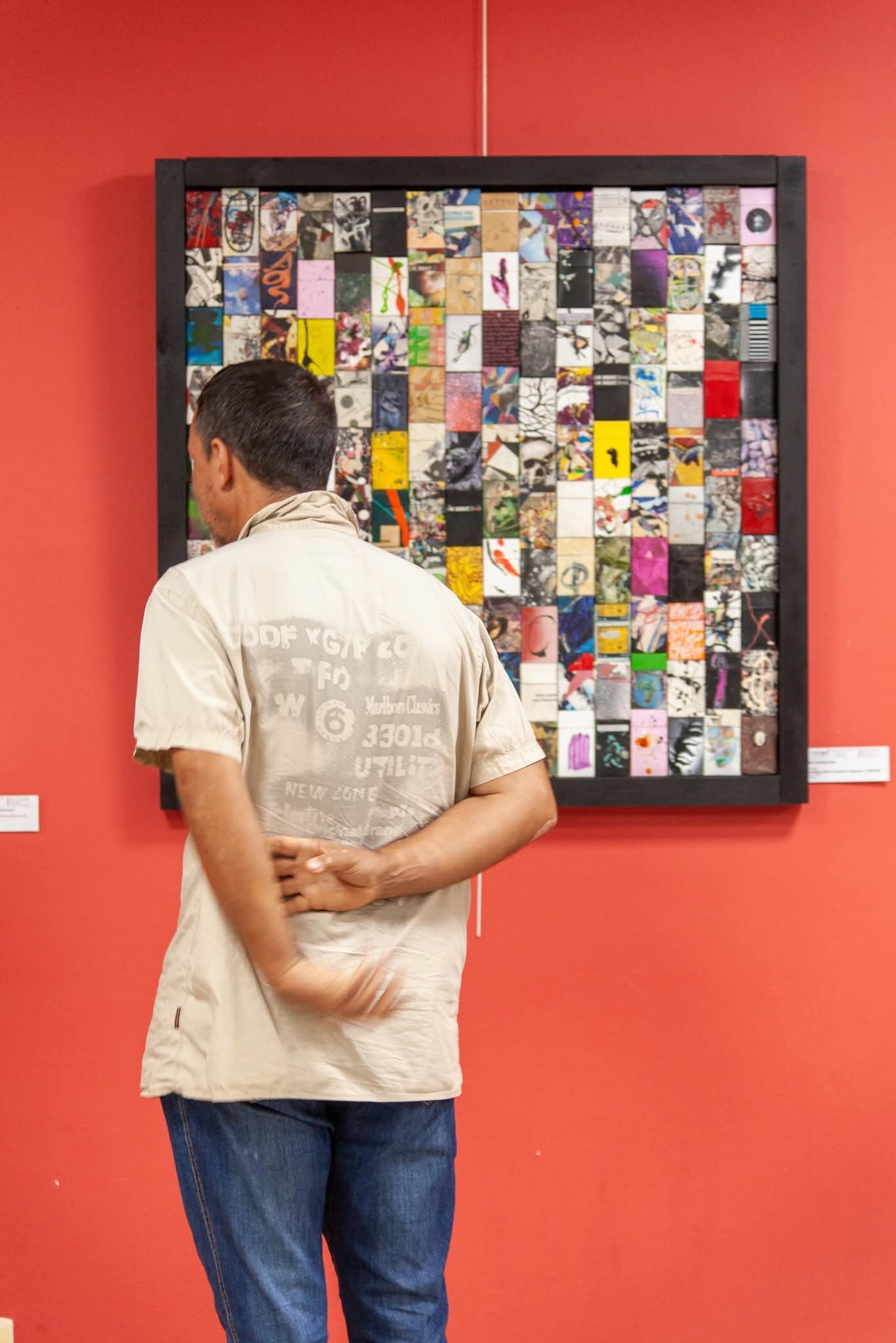 100 x 100 cm. Mixed media on upcycled cigarettes box (downloadable original music beat inside via qr code)